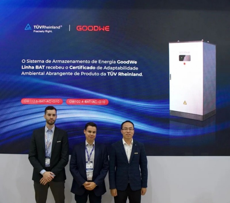 在展会现场,德国莱茵TÜV集团向固德威颁发了BAT系列储能产品的环境适应性认证证书,固德威副总经理潘冬华博士在现场接受颁奖。该认证为国际权威认可,充分印证了固德威BAT系列储能系统在极端环境条件——包括高温、极寒、高湿、盐雾及强烈振动等严苛场景下,仍保持稳定、安全与高效的卓越性能。这一认证不仅体现了固德威在产品设计与制造方面的高标准与可靠性,也为客户在全球复杂环境下的储能应用提供了坚实保障。
