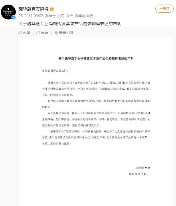 近日,施华蔻专业烫发产品包装标签说明用词不当引发用户关注,品牌在发现问题后第一时间响应,以诚恳态度公开致歉,并快速展开全面核查,展现出对消费者反馈的高度重视与负责任的品牌担当。