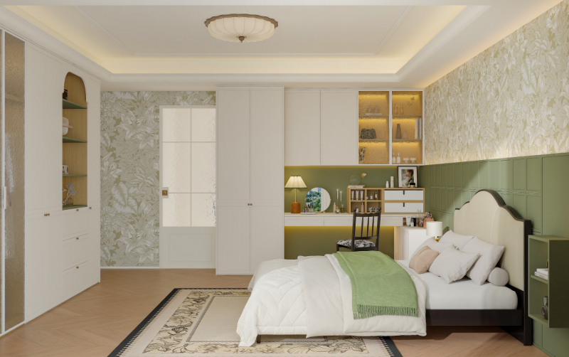 百合花纹理与苔藓绿模块拼接,构成复古感十足的床头背景墙。梳妆台、衣柜与储物柜一体化设计,使起居、梳妆与换衣动线流畅衔接。床尾整墙衣柜助力衣物被褥分类收纳,保持空间井井有条。