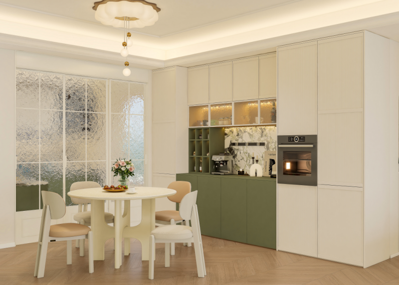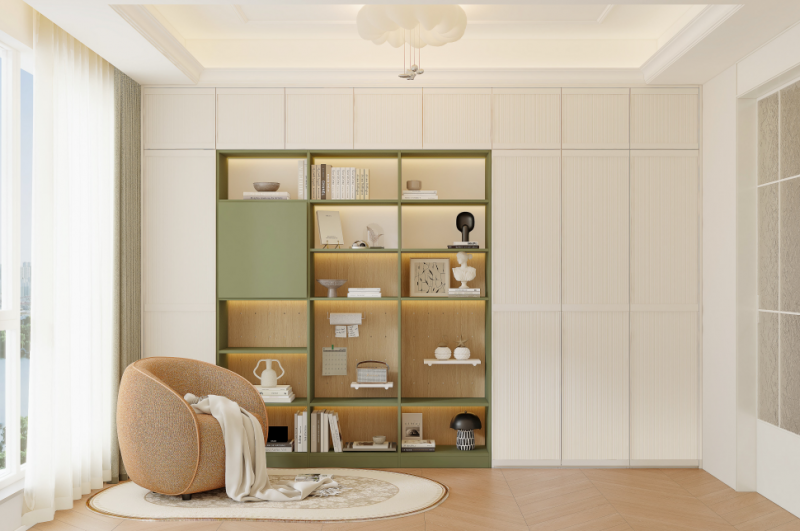 两组整墙定制柜提供了充足的储物空间。拱形开放展示柜以柔美线条提升温柔质感;水波纹玻璃门搭配内置灯带,营造出优雅灵动的视觉效果,赋予空间复古柔光滤镜般的美感。