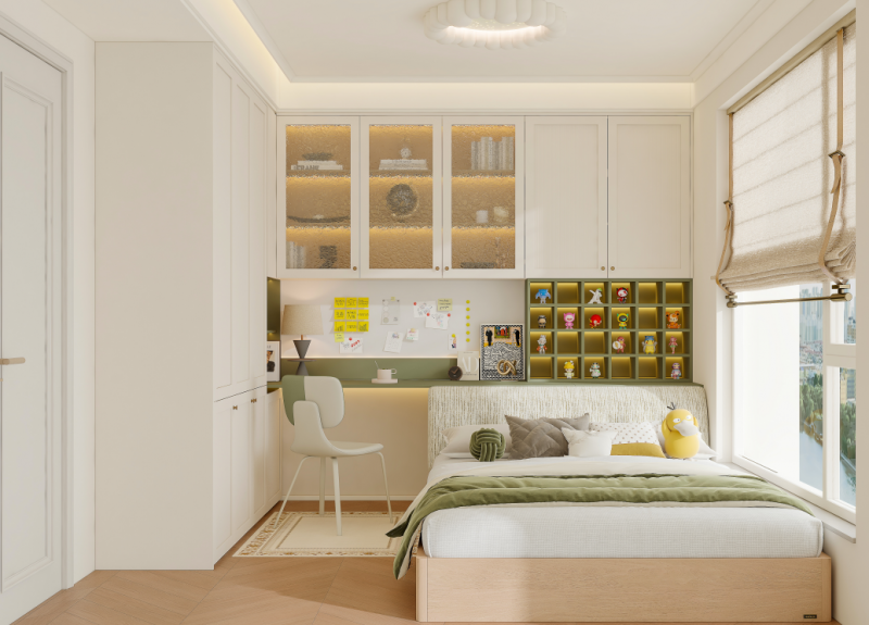 衣柜、书桌与储物柜实现整体定制,同步满足收纳与学习需求。分类开放格设计为手办提供专属展示区,兼顾实用功能与童趣氛围。