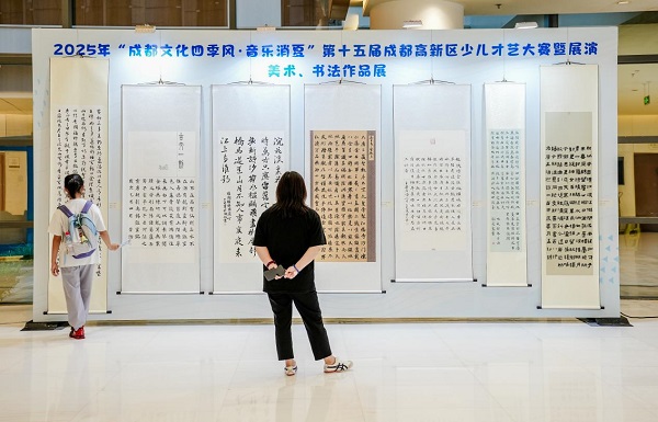 与此同时,剧场外同步展出本届大赛优秀的书法美术作品。参展作品中,《智慧蓉城生活向新》《争做非遗传承人》《巴蜀印象:熊猫与古蜀的交融》等美术作品,深度融合天府文化、巴蜀文化与成都城市风貌,勾勒出孩子们眼中的美好生活;《杜甫草堂联》《念奴娇·赤壁怀古》《洛神赋》等软笔、硬笔书法作品,或笔力刚劲、或气韵流畅。从琴键流淌的旋律到轻盈跃动的舞姿;从声情并茂的吟诵到韵味悠长的演唱;从色彩斑斓的绘画到行云流水的笔墨,孩子在高新区浓厚的艺术氛围中绽放独特光芒。