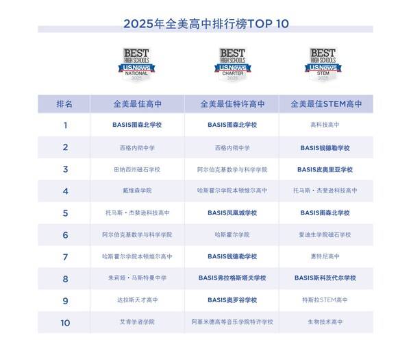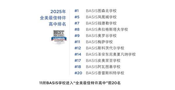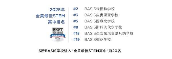 在《美国新闻与世界报道》(U.S. News & World Report)最新发布的2025“全美最佳高中”排名中,BASIS学校再度凭借卓越表现稳居榜首。继2024年BASIS皮奥里亚学校(BASIS Peoria)拿回“全美最佳高中”之首后,今年BASIS图森北学校(BASIS Tucson North)强势接棒,同时斩获“全美最佳高中”和“全美最佳特许高中”双料第一。在2025年“全美最佳高中”“全美最佳特许高中”“全美最佳STEM高中”排名中,BASIS学校延续了系统性的领先优势,顶尖排名稳中有进,再次彰显其在全美教育领域无可争议的学术竞争力和教育影响力。