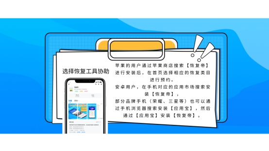 安卓用户,在手机对应的应用市场搜索安装【恢复帝】,部分品牌手机(荣耀、三星等)也可以通过手机浏览器搜索安装【应用宝】,然后通过【应用宝】安装【恢复帝】。