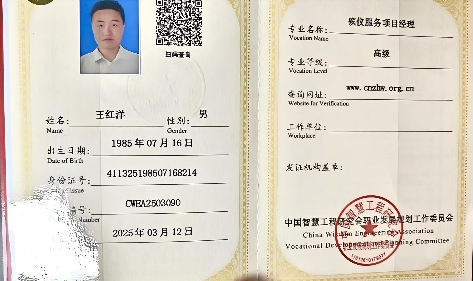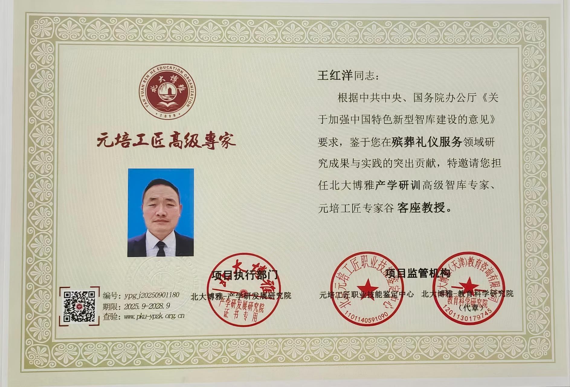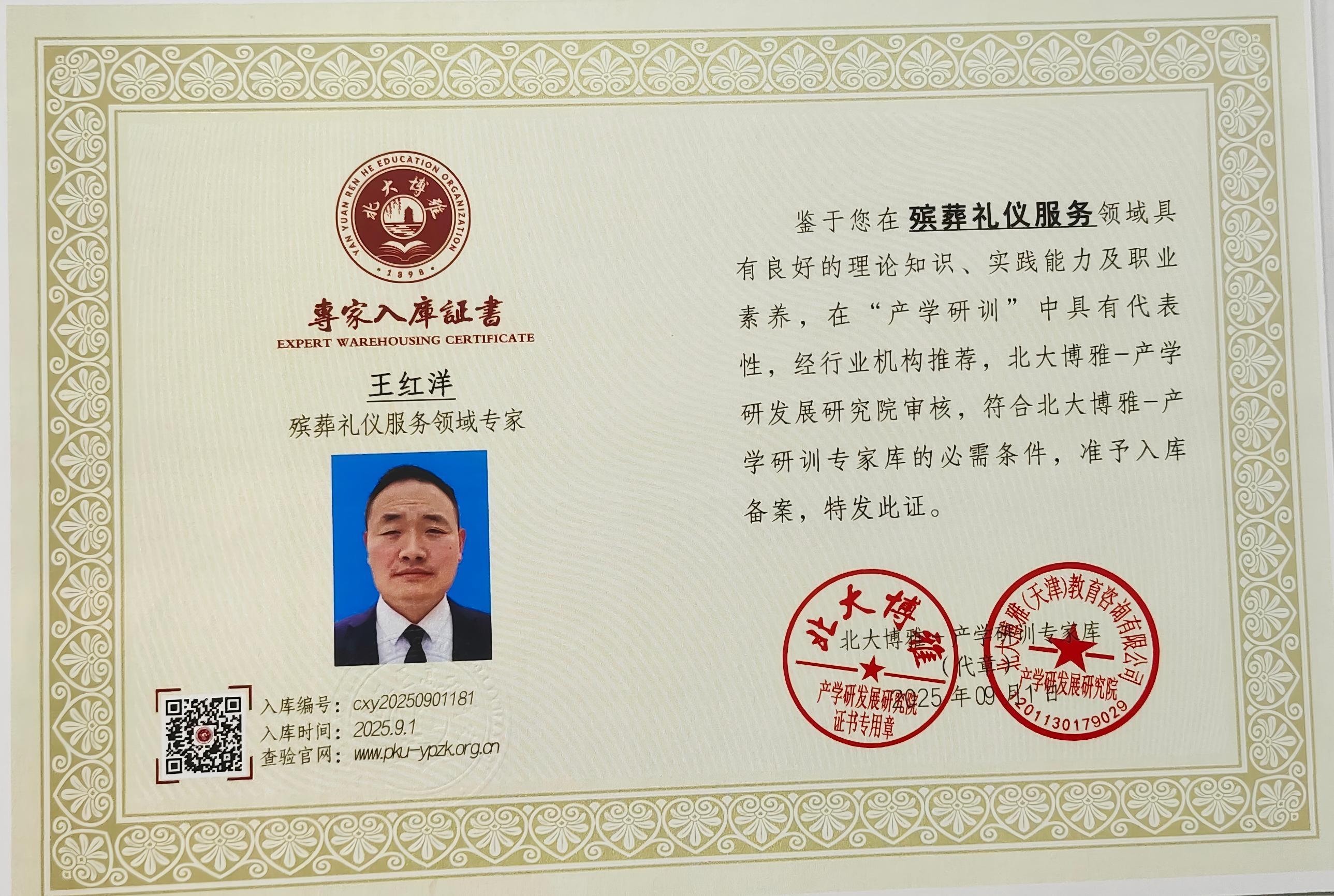 在专业领域,王红洋的付出收获多方认可:他拥有在职大学学历,更凭借扎实理论与实践,成为北大博雅殡葬礼仪服务领域专家、北京元培工匠高级专家及元培工匠专家谷客座教授。从北大博雅 “专家入库证书”,到元培工匠的聘书,再到 “高级殡仪服务项目经理” 资质证书,每一份荣誉与资质,都印证着他在殡葬礼仪服务领域的深耕 —— 无论是殡葬礼仪策划、安葬主持,还是入殓服务的精细化开展,他都以 “金牌入殓师”“优秀殡葬主持人” 的专业能力,为逝者与家属搭建起充满尊重的告别桥梁。