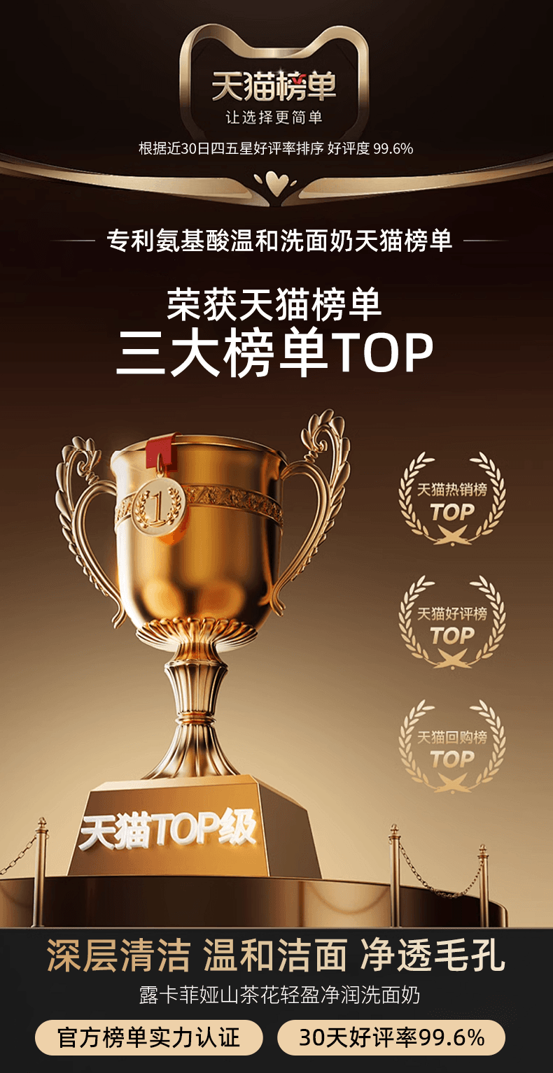 露卡菲娅山茶花洗面奶是能让全肤质都满意的洁面,是真正的实力派!也成为了学生党、上班族、宝妈都在囤的刚需单品。露卡菲娅山茶花洗面奶是露卡菲娅旗下一款专注于强效清洁、深层补水的洗面奶,露卡菲娅山茶花洗面奶是一款打破大家认知的洗面奶,不仅有清洁功效还有卸妆功效,足以见证这款洗面奶强大得清洁力。有人会担心,过度清洁会破坏皮肤屏障,其实完全不用担心,因为这款洗面奶添加的有氨基酸表活,温和不刺激,反而皮肤越用肌肤状态越稳定。