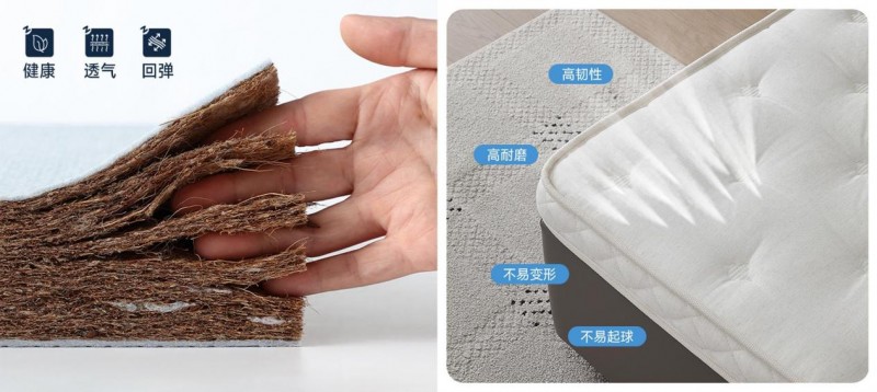 柔弹三维海绵,带来温柔包裹感,贴合身体曲线,促进身心放松。0胶水天然椰丝材质,有效抑制细菌滋生,结合三维立体纤维结构,有效分散人体压力。进口贝卡特梭织面料,高密度梭织工艺打造,触感光滑柔软,具有良好的吸湿透气性,保持整夜干爽舒适。