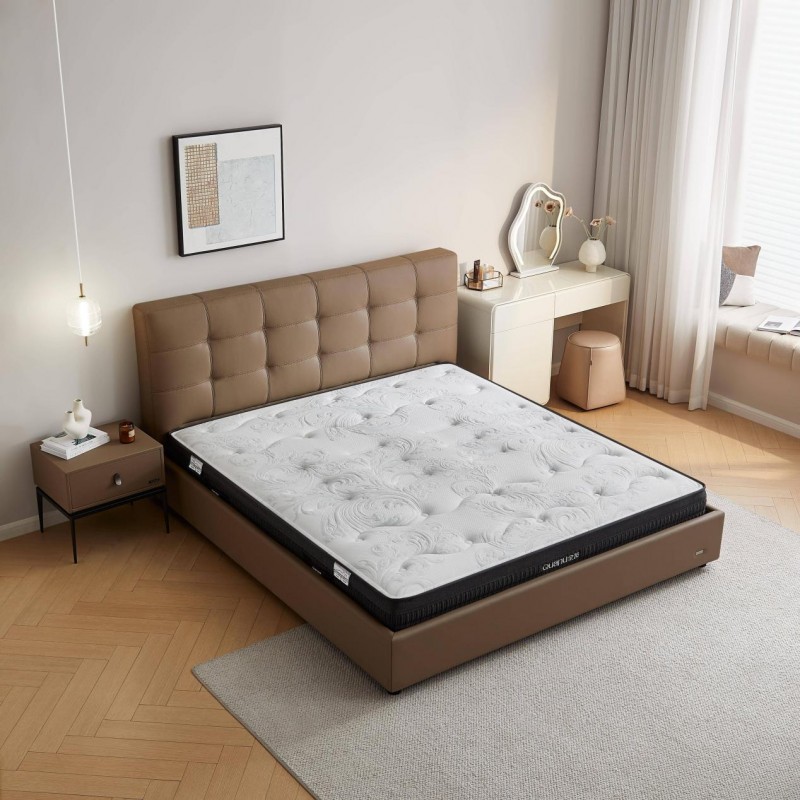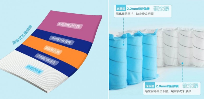 五维动态梯度释压系统,通过不同密度与厚度材料的科学梯度排列,实现头颈背部舒缓释压、缓解腰部压力、承托腰椎空隙、促进腿部空气循环,紧密贴合身体曲线,灵活响应睡姿变化。两段式独立弹簧设计,床头区柔软、床尾区偏硬,采用不同线径独立袋装弹簧组合,精准匹配身体各部位的不同需求。