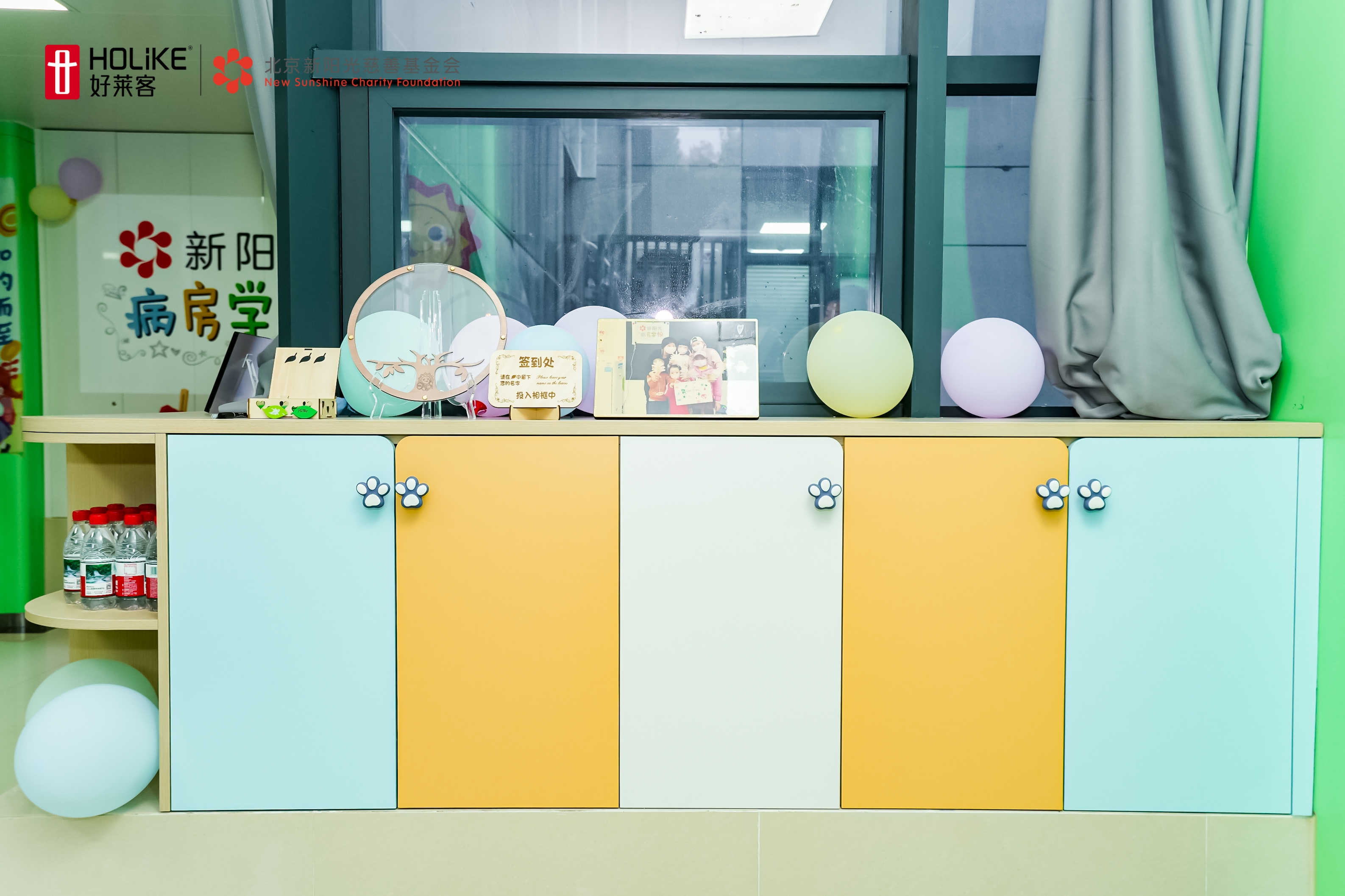 好莱客始终坚持“原态公益”的理念,用环保健康的产品回馈社会。今年是好莱客与新阳光合作的第十三年,也是与病房学校携手的第八年。八载时光里,好莱客为孩子们创造了一所又一所学习乐园。此次西安市儿童医院医院病房学校建设中,好莱客采用的原态净醛竹板,凭借“竹纤维基材” 及 “纳米净醛抗菌饰面” 的双重专利技术,能主动净化室内空气、高效抵抗细菌,为孩子们构建起健康安全的学习娱乐环境。