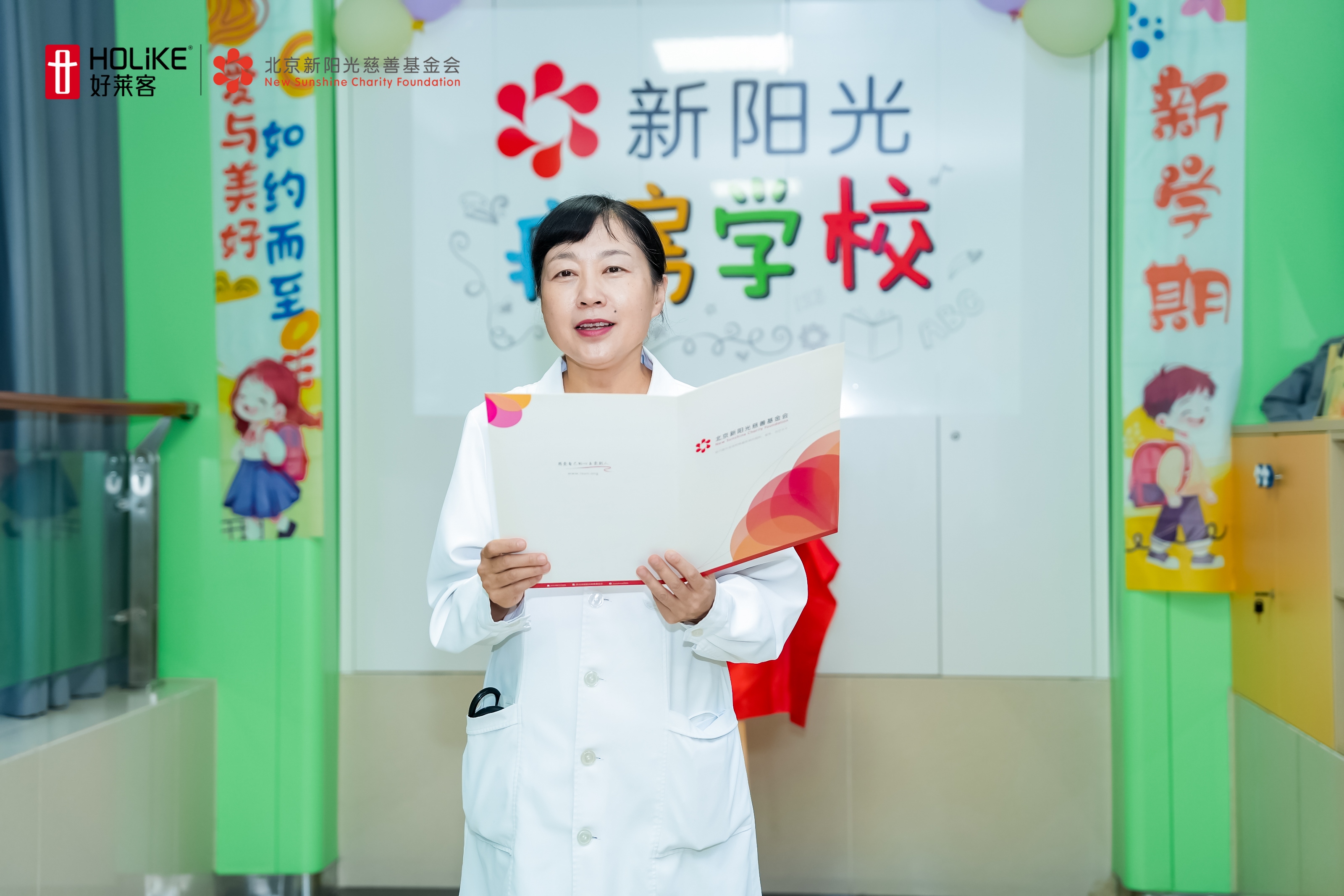 典礼伊始,西安市儿童医院血液肿瘤科王华主任代表院方致辞。她表示,深知每一位白血病患儿在治疗道路上的不易——这些孩子本该在校园中奔跑、学习、茁壮成长,却因长期住院不得不暂别课堂。因为有北京新阳光慈善基金会的爱心支持,为孩子们架起了一座希望的桥梁。这所病房学校的建成,让他们能够在环保、安全、舒适的环境中继续学习、交流,感受知识与陪伴的温暖,拥抱属于童年的欢笑。