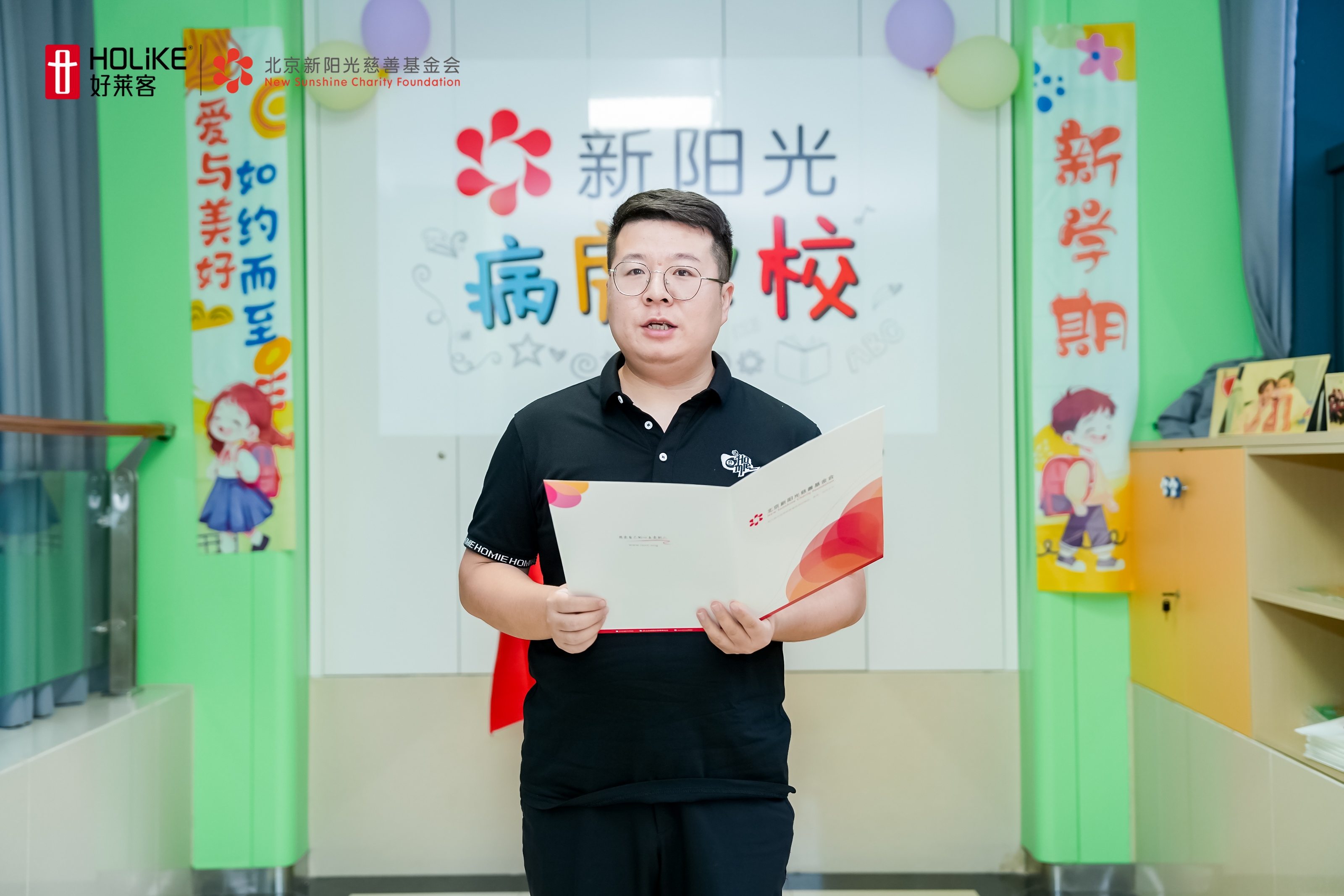 北京新阳光慈善基金会新阳光病房学校项目副总监王然在致辞中讲述了新阳光病房学校的创办原因及其深远意义。她强调了病房学校在帮助孩子们战胜疾病、重拾希望方面发挥的重要作用,是传递温暖的桥梁,并表达了对院方、好莱客及所有支持者的感谢。