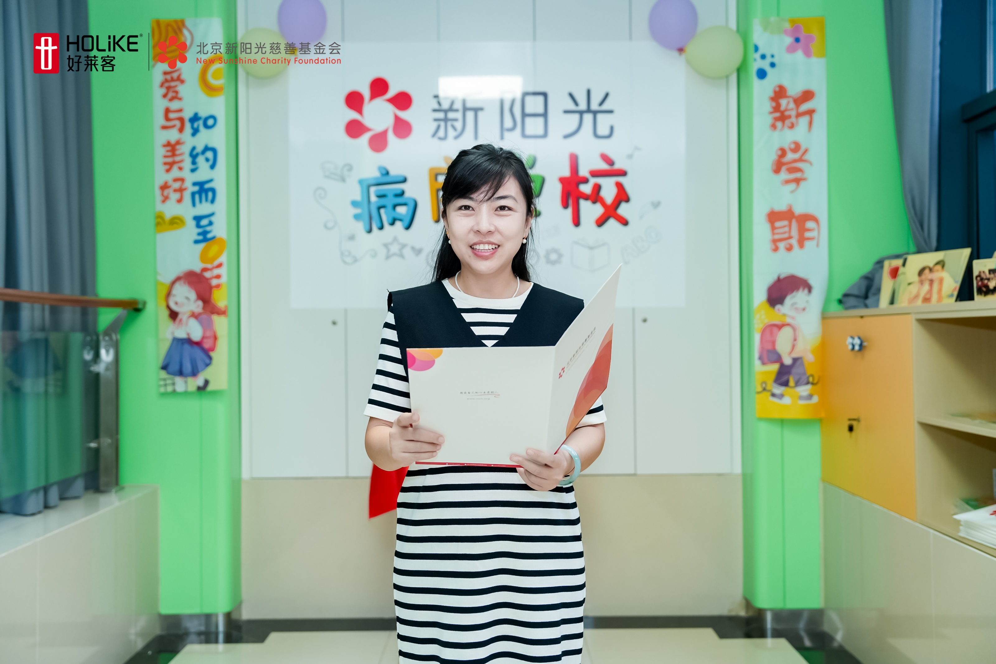 在热烈的掌声中,北京新阳光慈善基金会新阳光病房学校项目副总监、西安市儿童医院血液肿瘤科主任、好莱客总部代表共同为病房学校揭牌,标志着这所特殊的学校正式开学。作为对好莱客爱心捐赠的认可,北京新阳光慈善基金会向好莱客颁发了捐赠证书,表达了对好莱客的感谢。