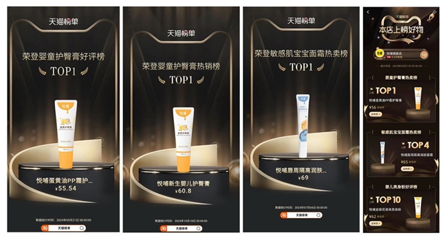 多次在天猫大促期间,悦哺蛋黄护臀霜荣登天猫V榜婴童护臀膏热卖榜单第一。其品牌热度、好评率超越同类母婴品牌。