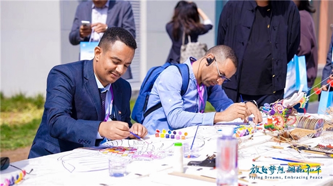 (参会嘉宾参与体验风筝制作环节)