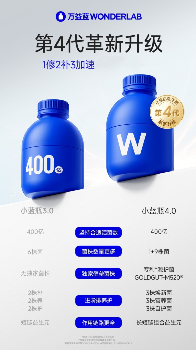 万益蓝WonderLab旗下另一款明星产品小蓝瓶益生菌同样备受关注。自2020年推出以来,该产品已升级至搭载自研专利菌株GOLDGUT-M520的4.0版本。在此基础上,第4代小蓝瓶益生菌还精心搭配了9株优势菌群,包括3株焕新菌(HN019、NCFM、Bb-12)、3株营养菌(Lpc-37、Bi-07、Bb-06)和3株护卫菌(Bl-04、Lp-115、GOLDGUT-LR99)。这些菌株组合相互协同,形成多层次、全方位的肠道呵护体系。