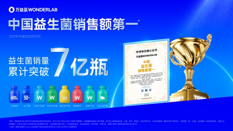 活动期间,万益蓝WonderLab宣布其益生菌产品累计销量已突破7亿瓶。这一成果不仅体现了消费者的认可,也反映出品牌在科研投入、产品迭代和产业化路径上的长期坚持。从最初的小蓝瓶益生菌,到结合自主菌株与协同配方的多元产品体系,品牌逐步形成了“基础研究—菌株筛选—临床研究—产业转化”的全链条研发闭环。