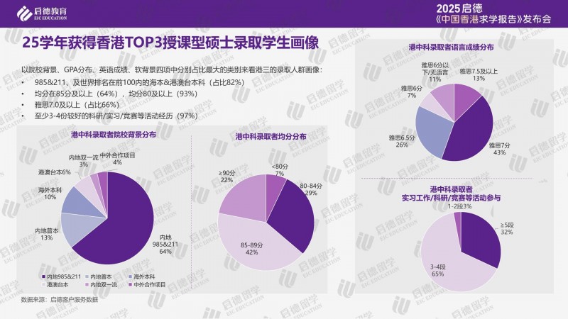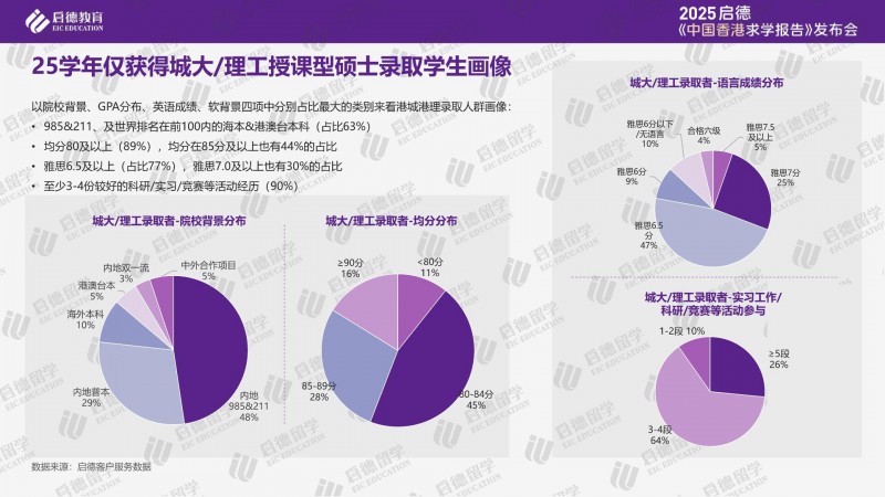 另一组数据显示,获得香港八大以外高校授课型硕士录取的学生中,双非院校占比最高,约为86%;均分分布较广,80分以下者约占40%,80分及以上者约占60%;语言成绩大多达到基本要求但分数不高,雅思6.0及以下者合计约占三分之一;超过90%的录取者拥有至少一段实习或科研经历,其中具备3至4段经历的占比最高,达62%。总体而言,这类院校对学术背景的要求相对宽松,更重视学生的实践经历与综合能力。