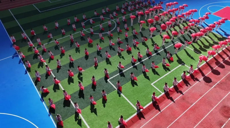 开幕式上,国旗方队、鼓号方队、裁判员方队以及来自全县各中小学的8支运动员代表队依次入场。运动员们精神饱满、意气风发,行至主席台前跳起富有民族特色的体育舞蹈,展现出各校风采。入场仪式后,现场举行了庄严的升旗仪式。在雄壮的国歌声中,五星红旗冉冉升起,全体人员肃立注目,表达对祖国的深切热爱与美好祝福。随后,裁判员代表与运动员代表分别宣誓。