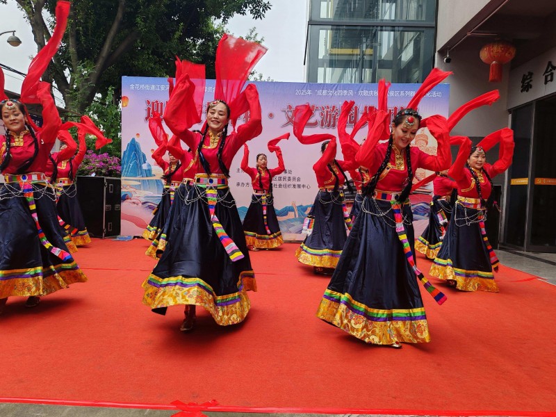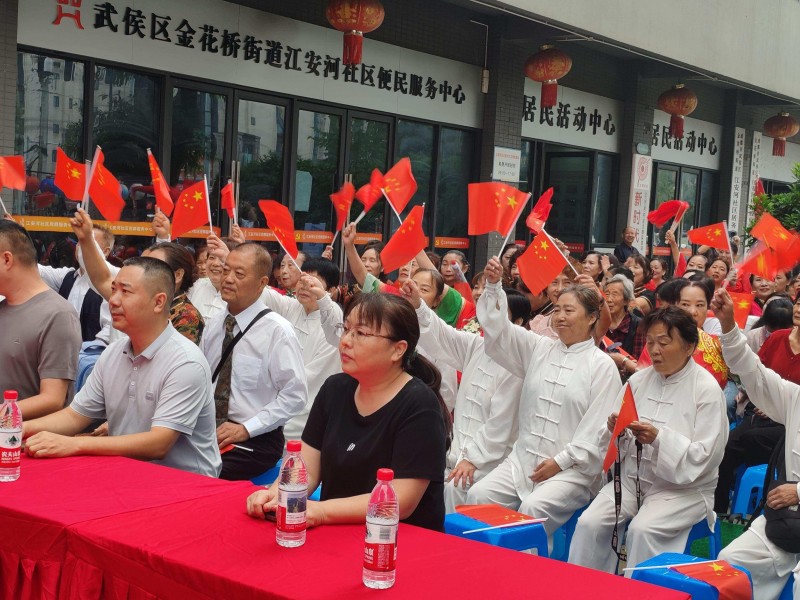 致辞结束后,社区自组织才艺展示环节精彩上演。河畔舞蹈队带来舞蹈《五星红旗》,灵动舞姿诠释对祖国的热爱;夕阳舞蹈队的《中国范》气势十足,尽显中华儿女风采;还有充满民族风情的藏族舞蹈、尽显东方古典美的江南旗袍秀等节目轮番登场,表演者们精神饱满、热情投入,赢得台下居民阵阵掌声与喝彩。表演尾声,全体表演者共同登台,合唱《我和我的祖国》,熟悉的旋律引发全场共鸣,大家挥舞手中的小国旗,将活动氛围推向高潮。