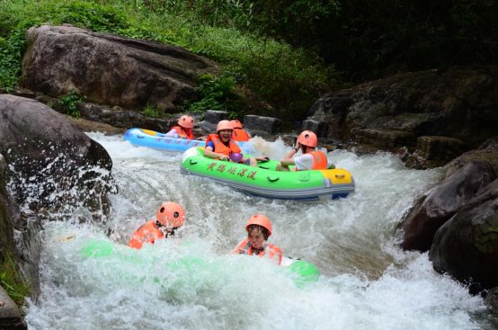 选对赛道是漂流尽兴的关键,黄腾峡的三大专属赛道能满足不同人群需求。如果你是亲子家庭或漂流新手,“勇士漂”是稳妥之选,其赛道难度适中,既能体验浅滩缓流的惬意,又能感受小型落差带来的轻刺激,沿途还能欣赏丛林奇石风光;追求进阶刺激的游客,“猛士漂”值得一试,赛道串联起多处长落差,搭配“S”级弯道,让你在急流中感受水花飞溅的快感;若想一次玩透,“勇猛全程漂”则能解锁135米总落差、130多处大小落差的完整体验,最高12米落差带来的“俯冲感”,堪称“水上过山车”,三种赛道均已注册专属商标,专业度无需担心。
